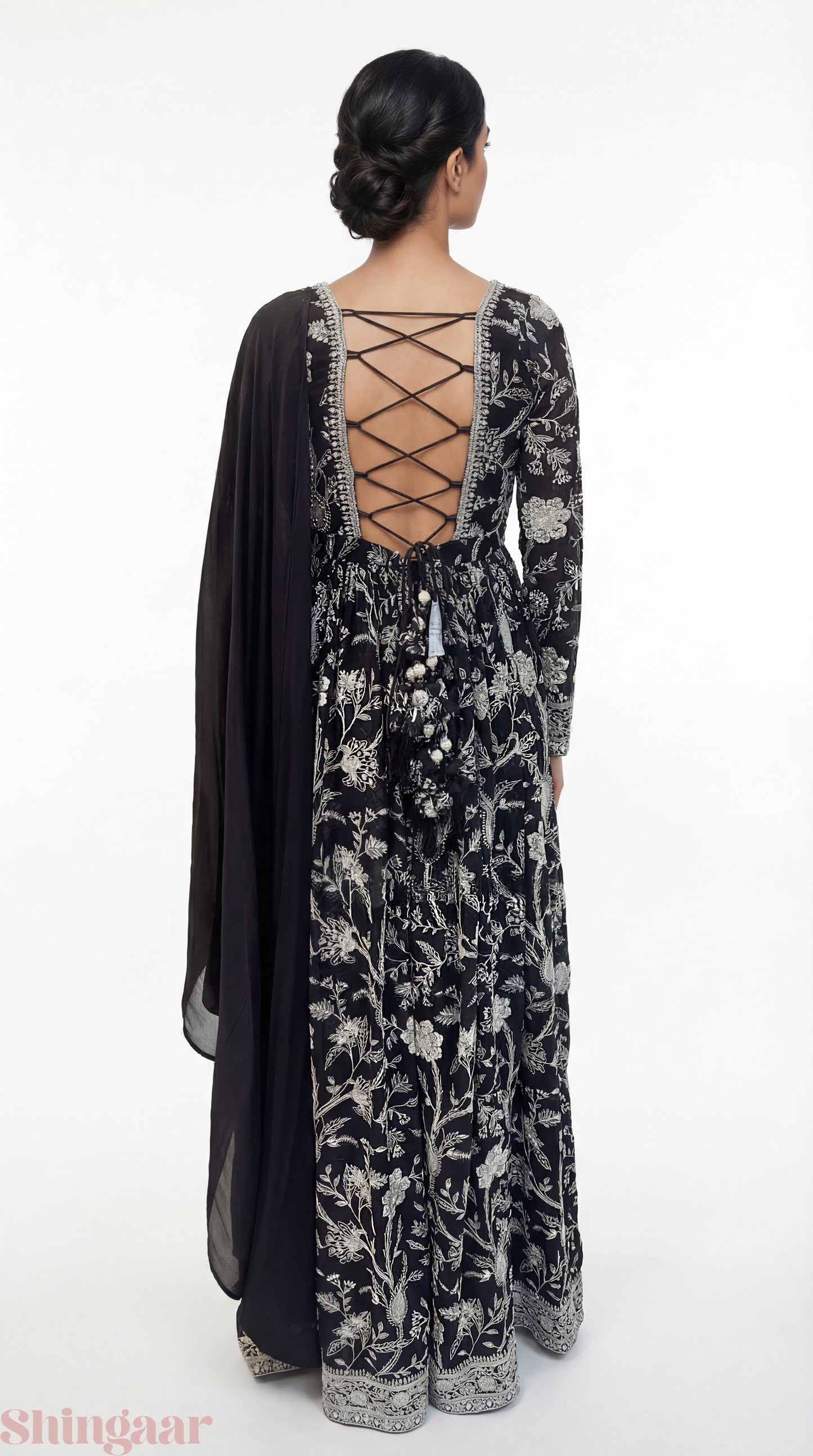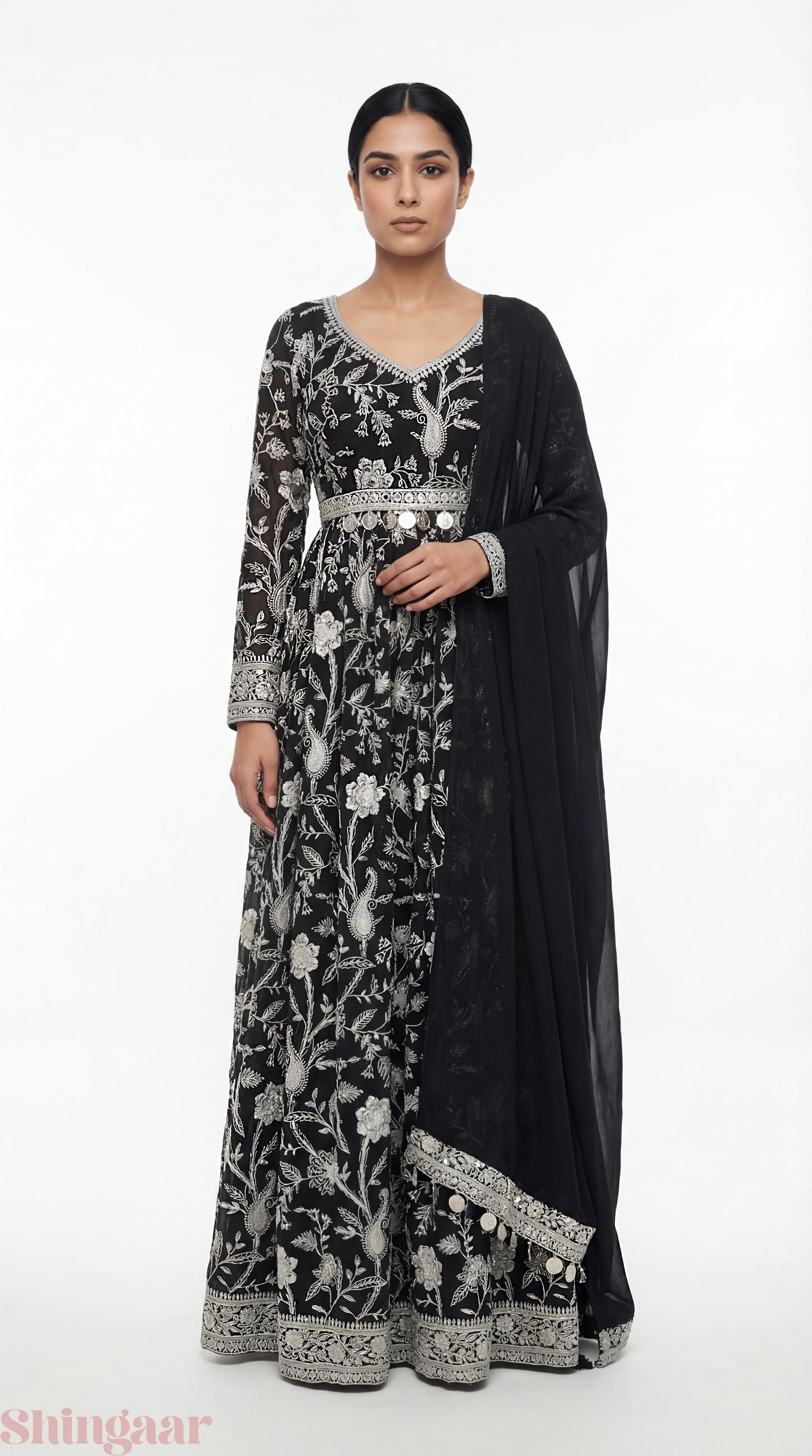 Black Georgette Gown with White Thread Embroidery, Mirror & Coin Details