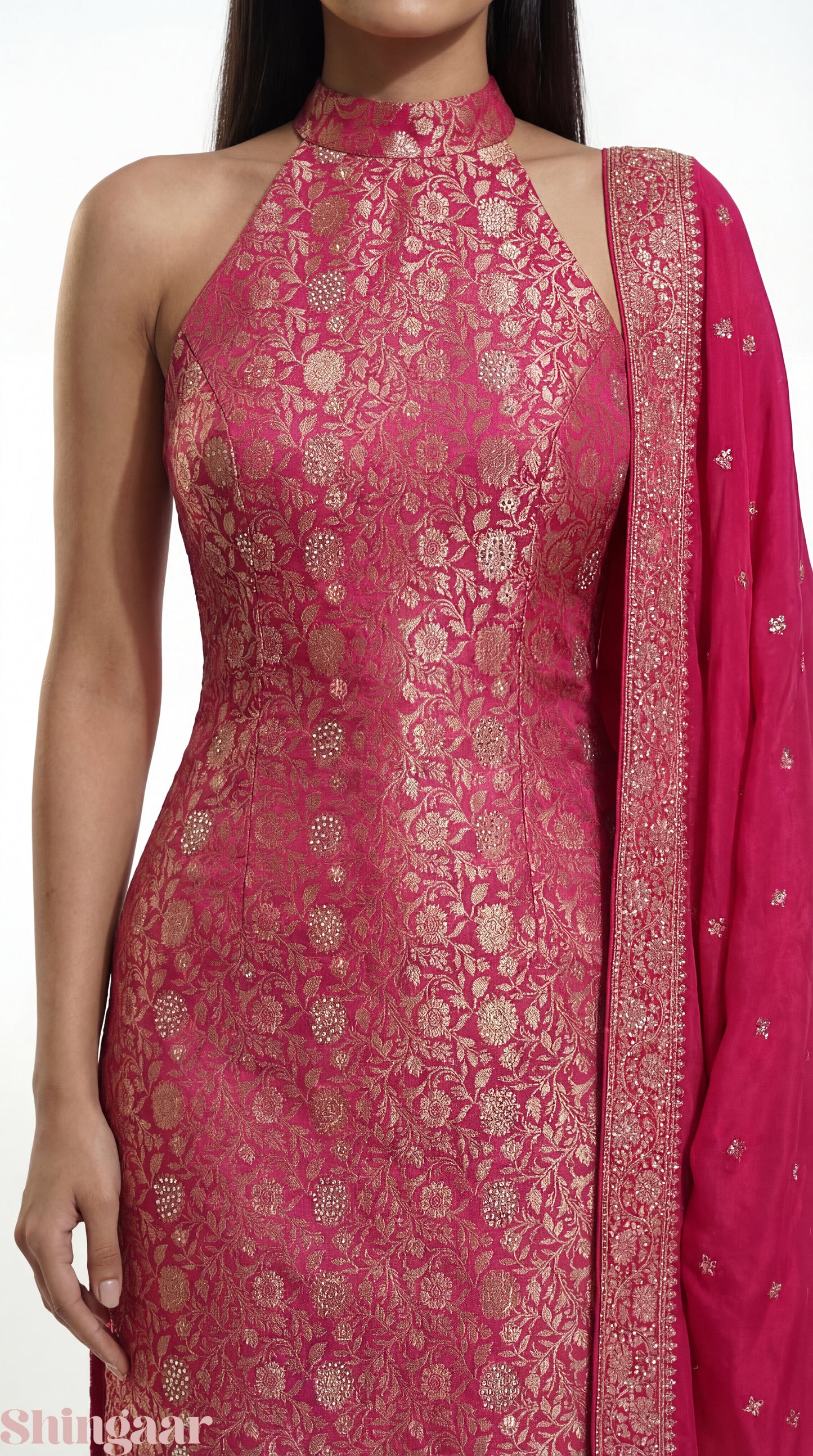 Banarasi Silk Palazzo Suit with Statement Embroidered Neckline Pink