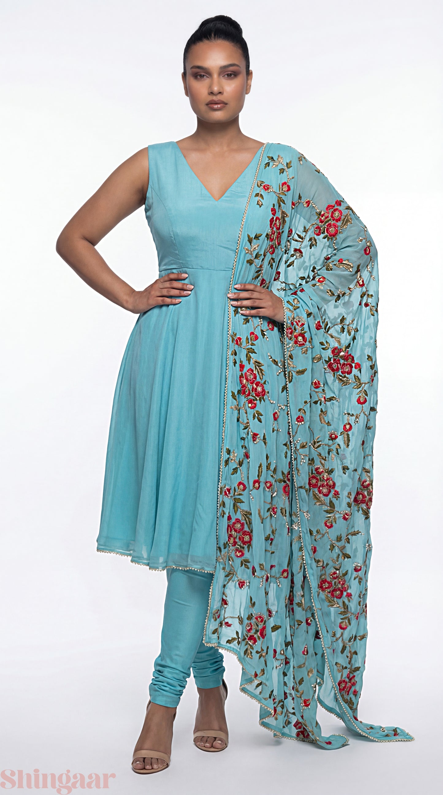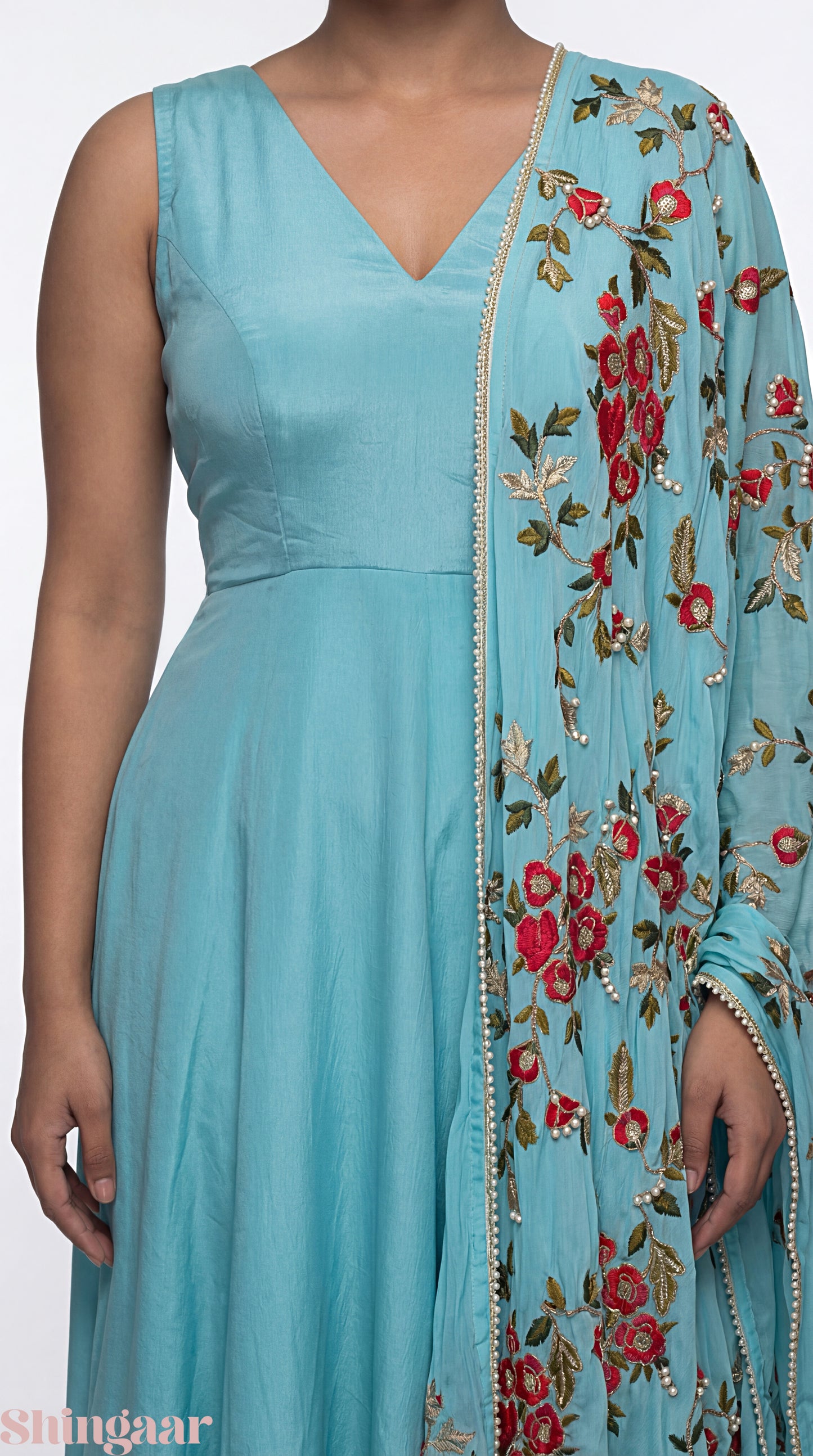 Sky Blue Chinon Anarkali with Floral Embroidered Dupatta
