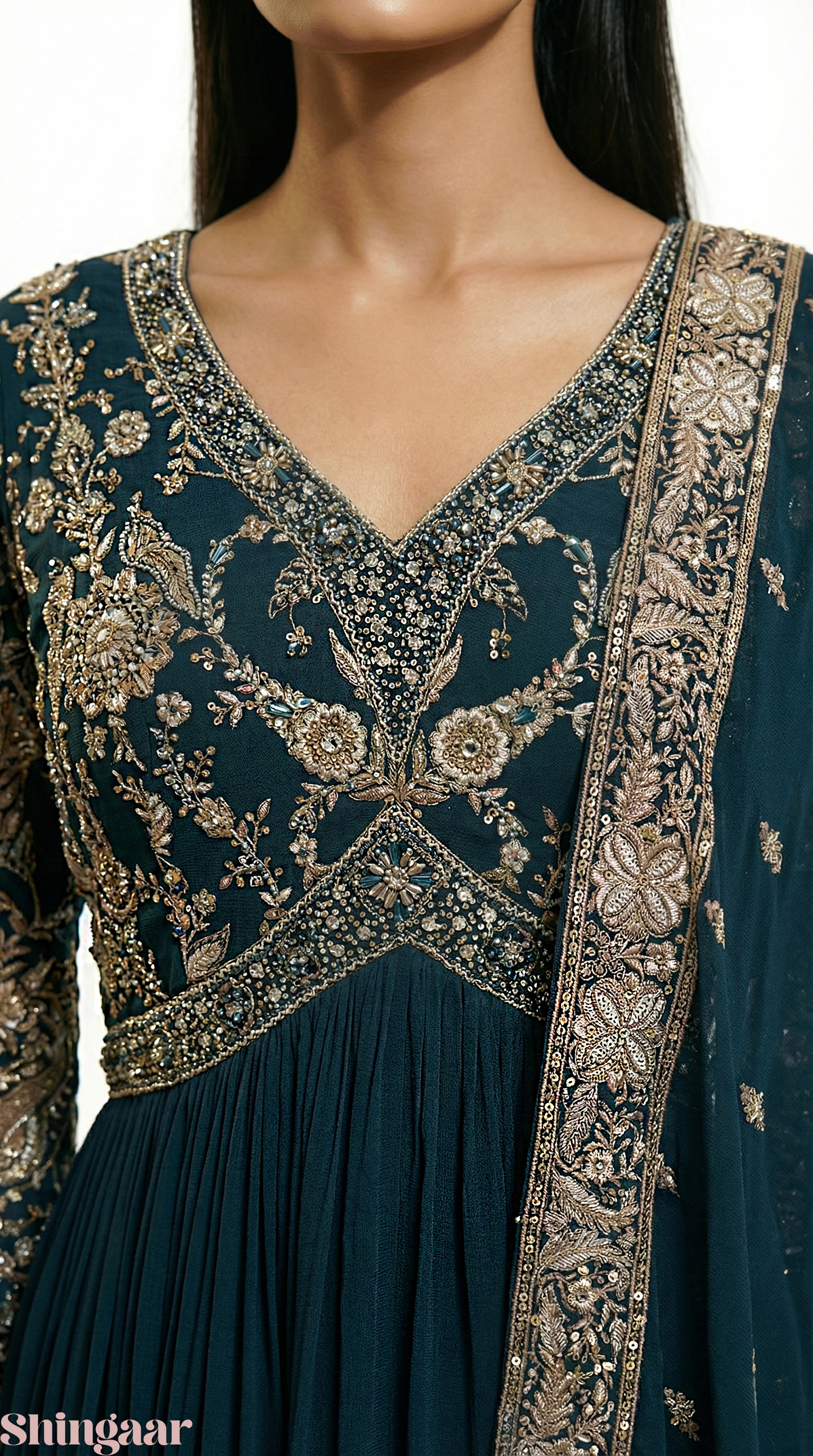 Elegant Petrol Blue Georgette Gown with Antique Gold Embroidery