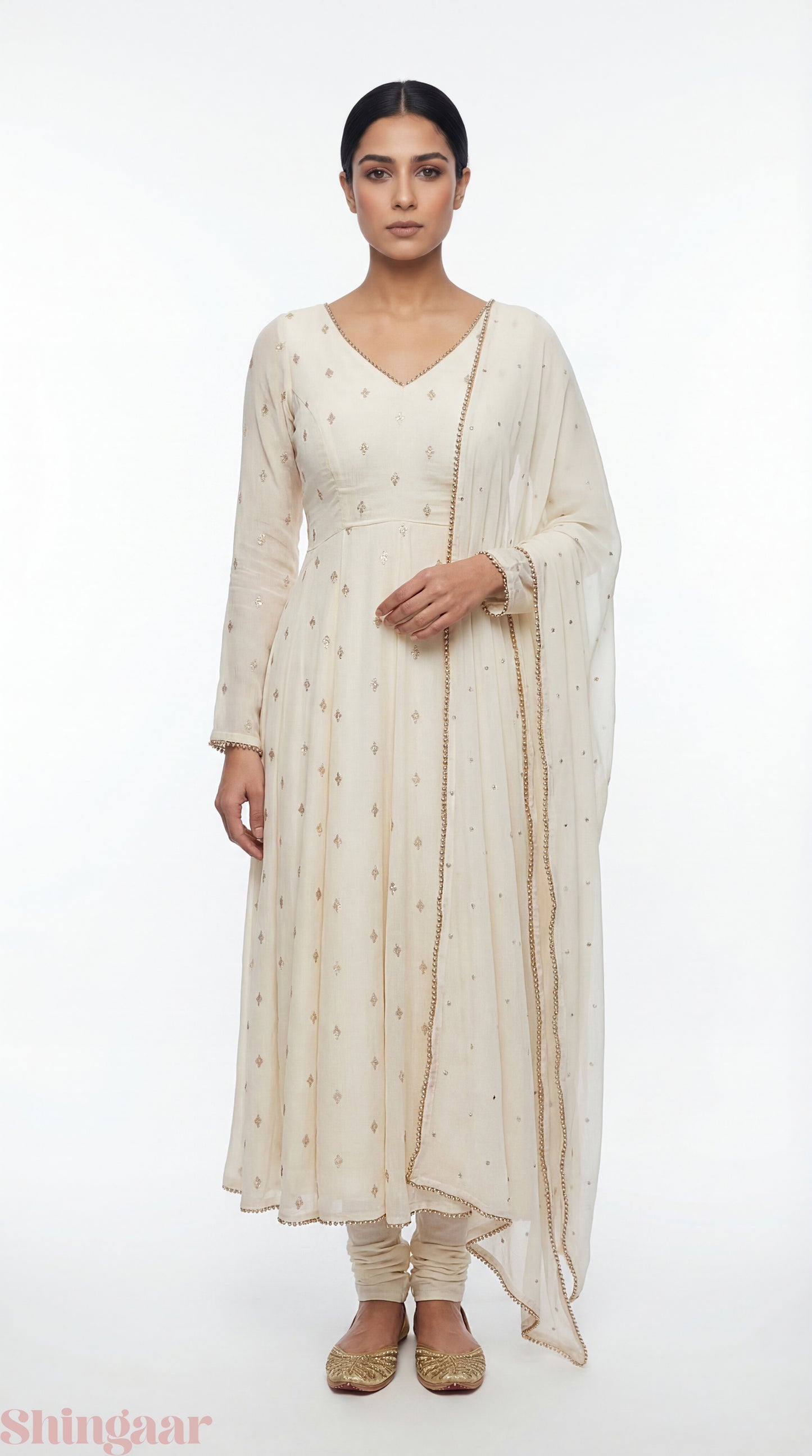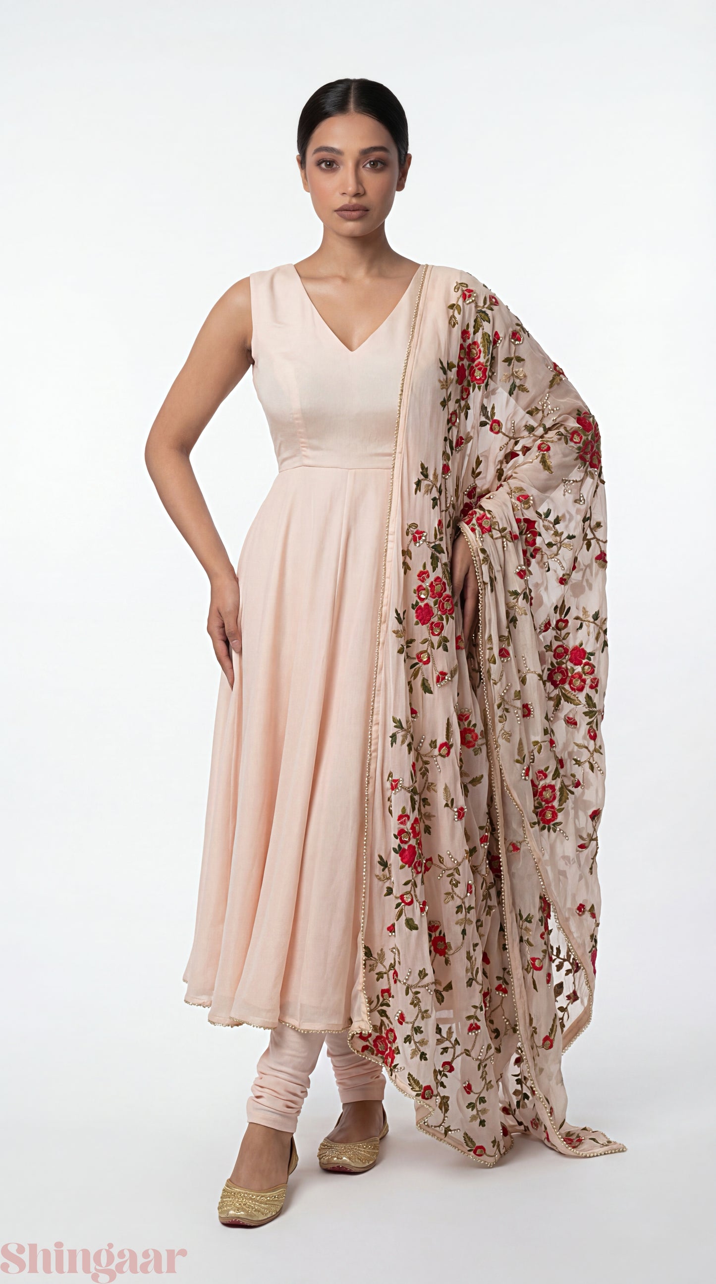 Soft Peach Chinon Anarkali with Floral Embroidered Dupatta