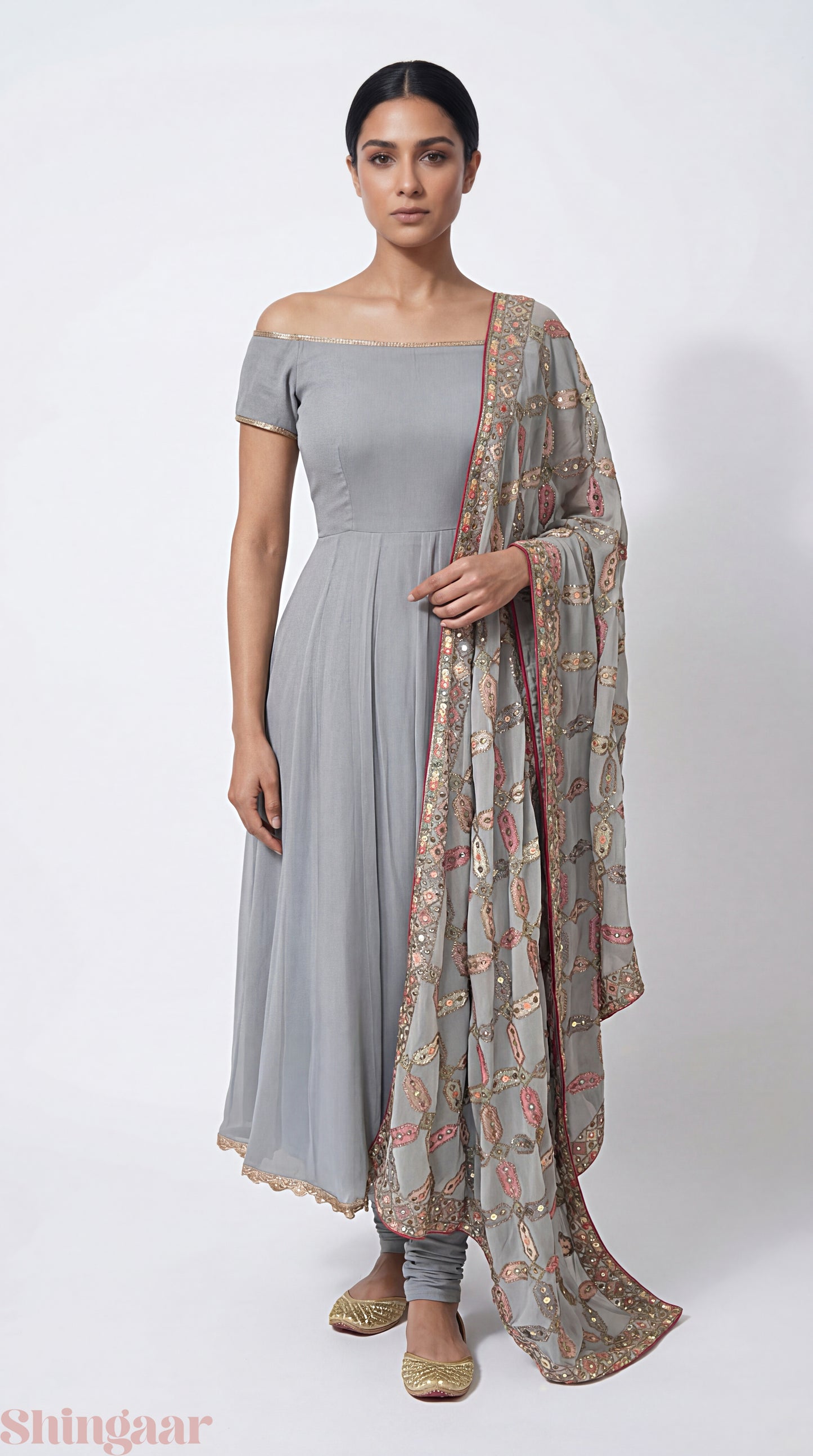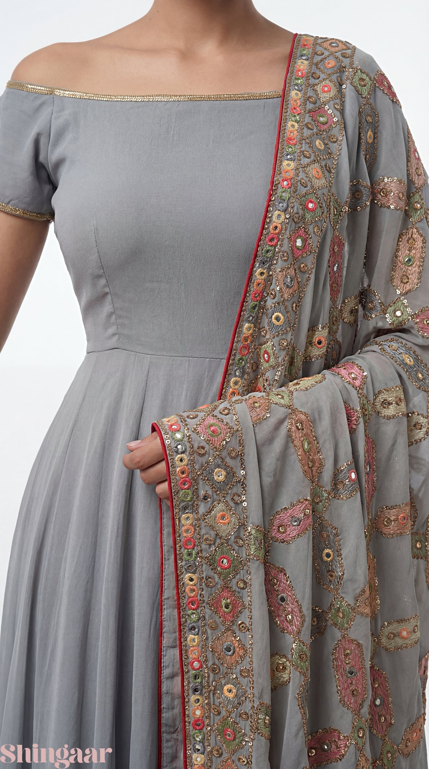 Off the Shoulder Georgette Anarkali with Embroidered Dupatta Grey