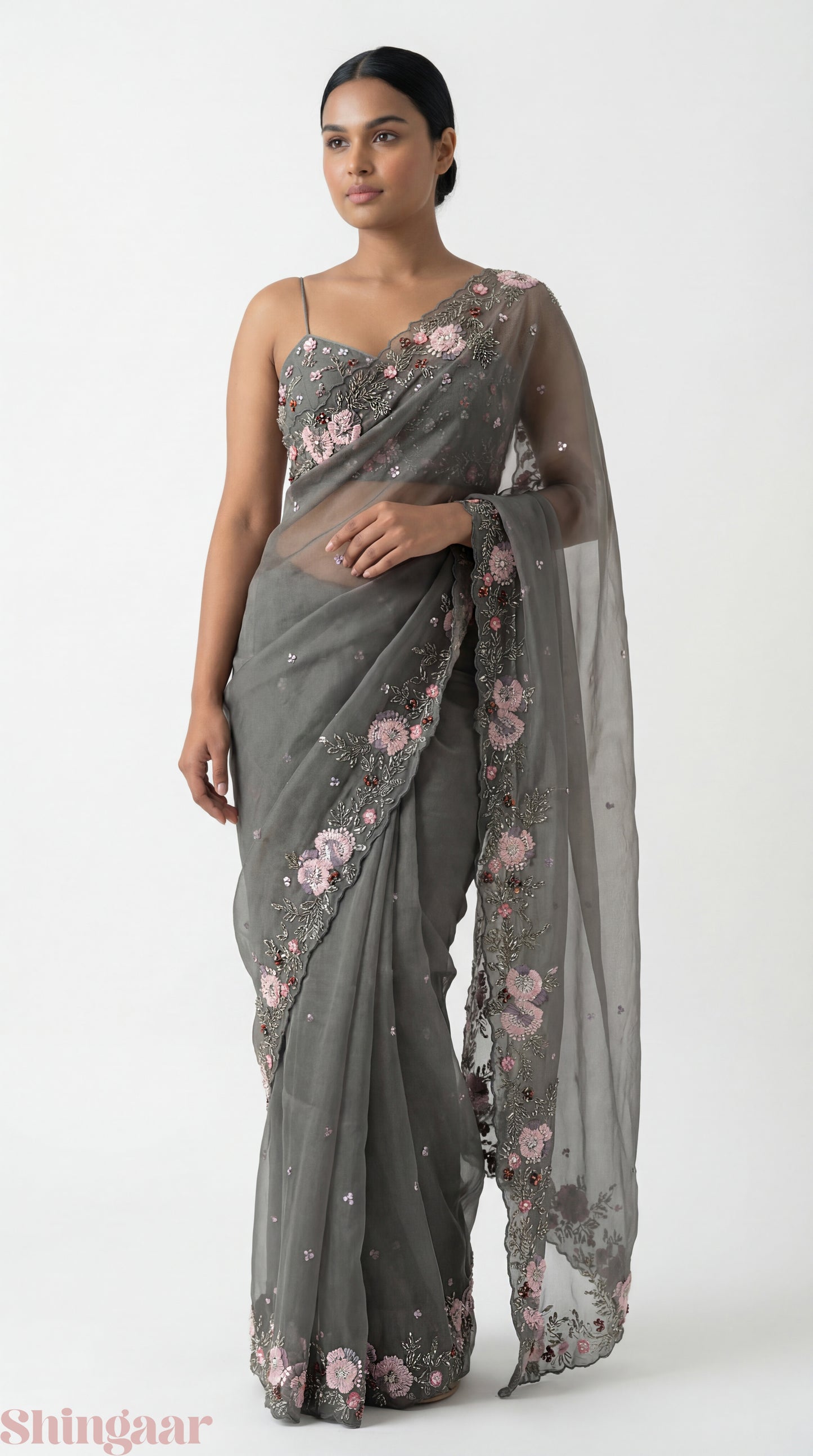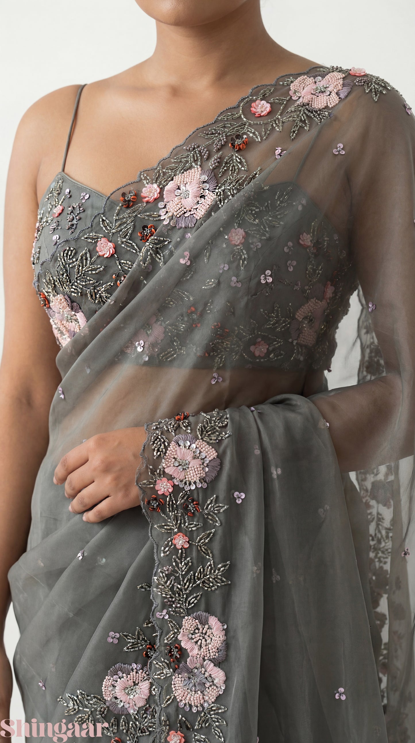 Whispered Glamour Hand-Embroidered Organza Silk Saree Grey
