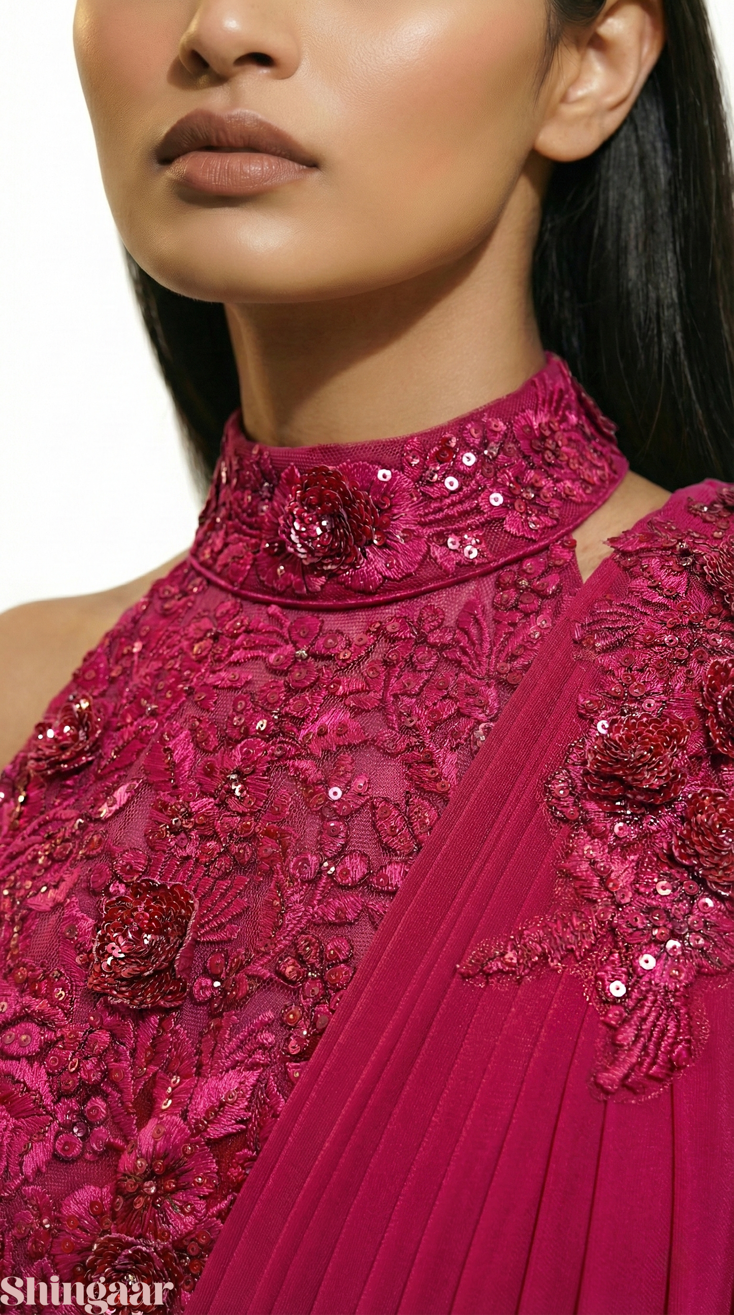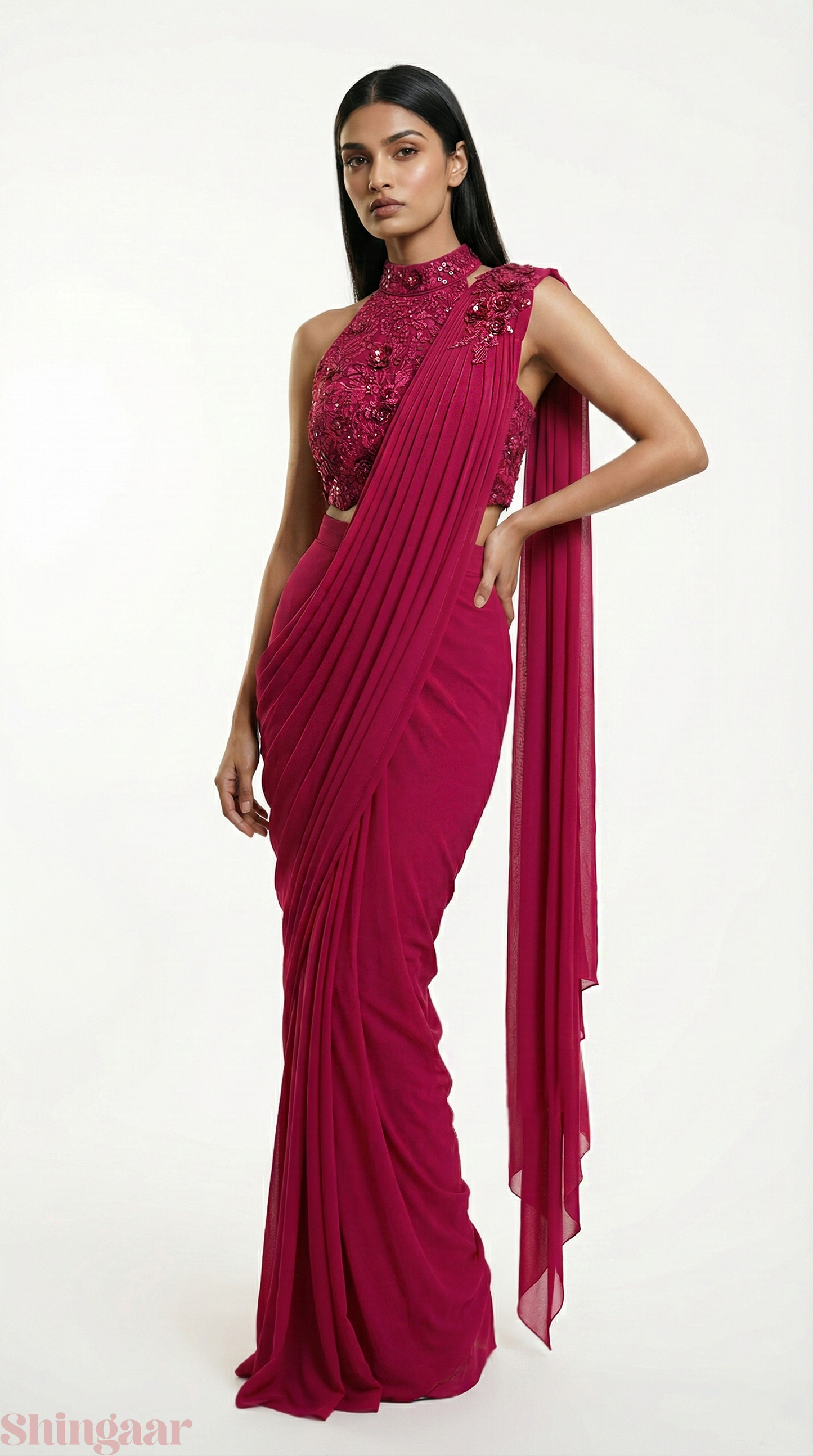 Pre-Pleated Lycra Saree with Appliqué Embroidered Blouse Pink