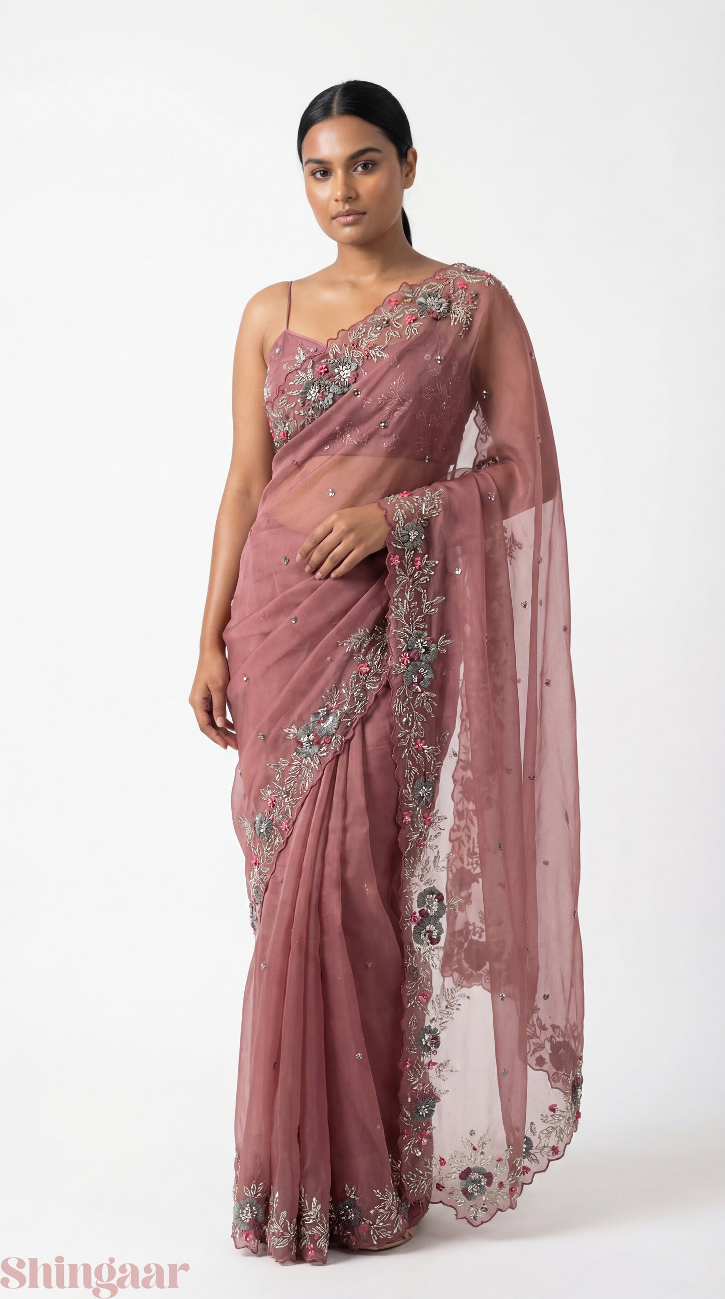 Whispered Glamour Hand-Embroidered Organza Silk Sari Pink