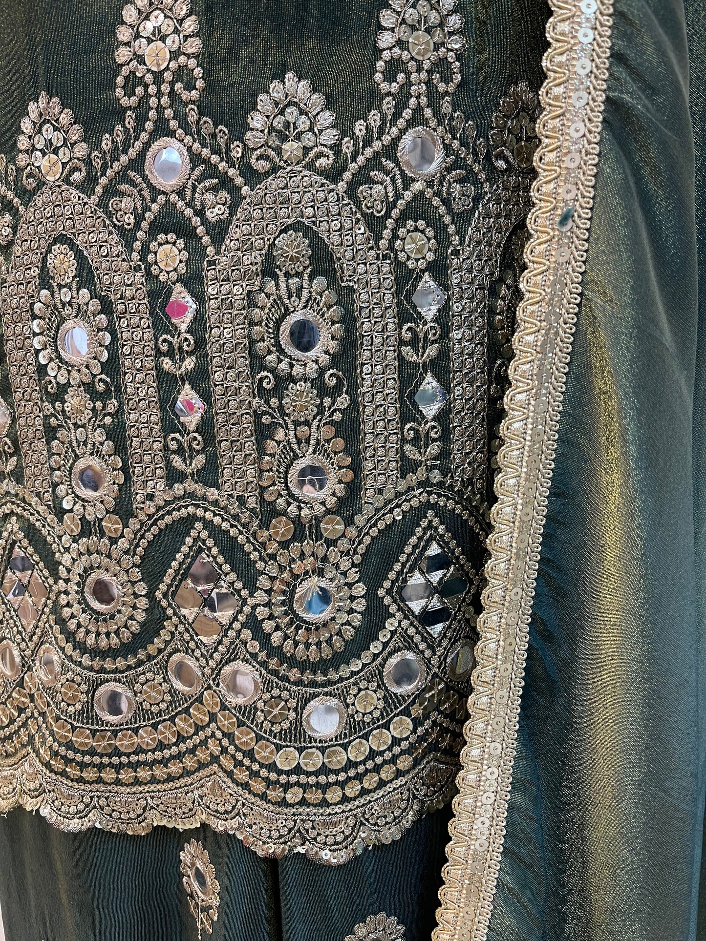 Command attention with confidence in this dark mehndi two-tone crepe tissue trouser suit, adorned with golden sequin embroidery and oversized mirrors, featuring a bold deep neckline layered with an elegant inner for a striking, regal finish.
