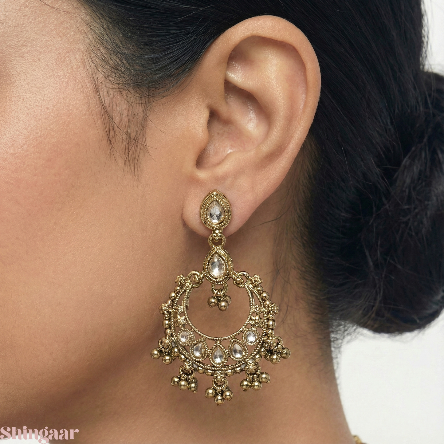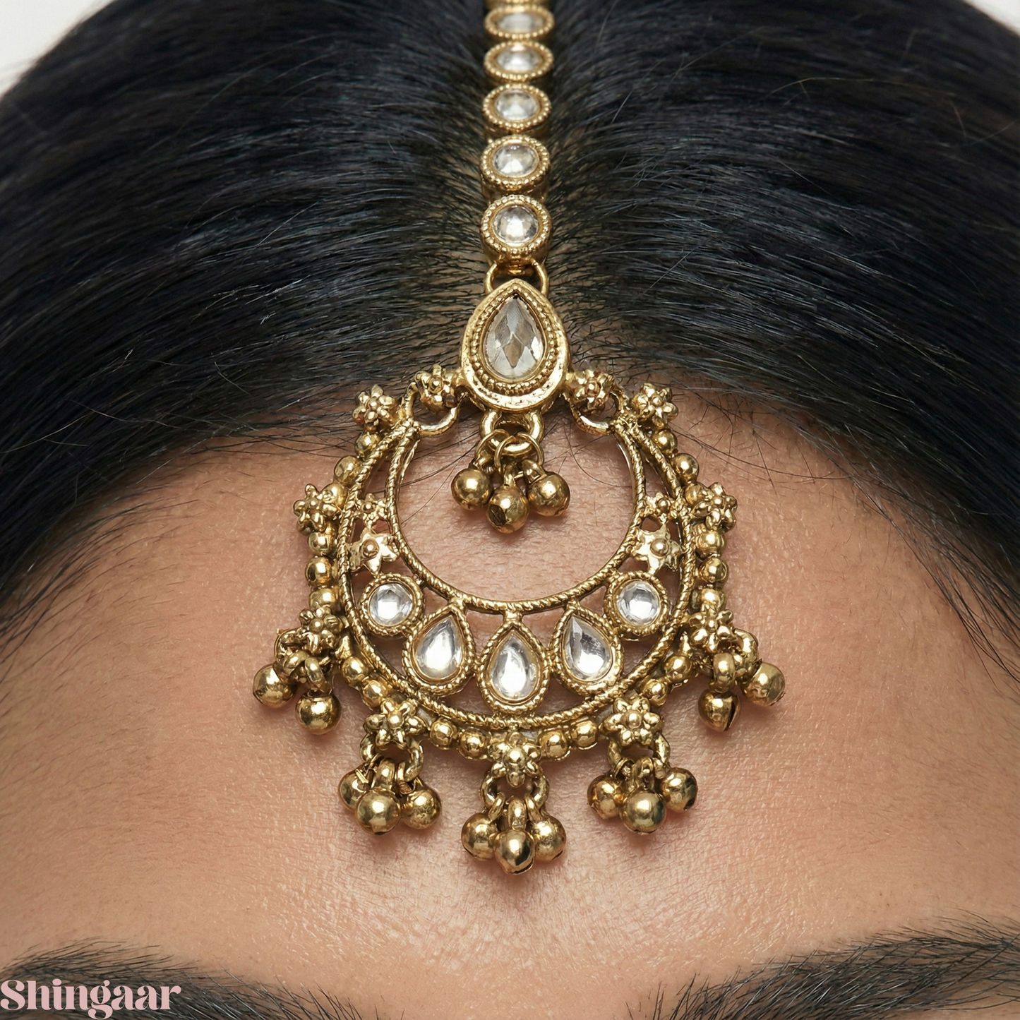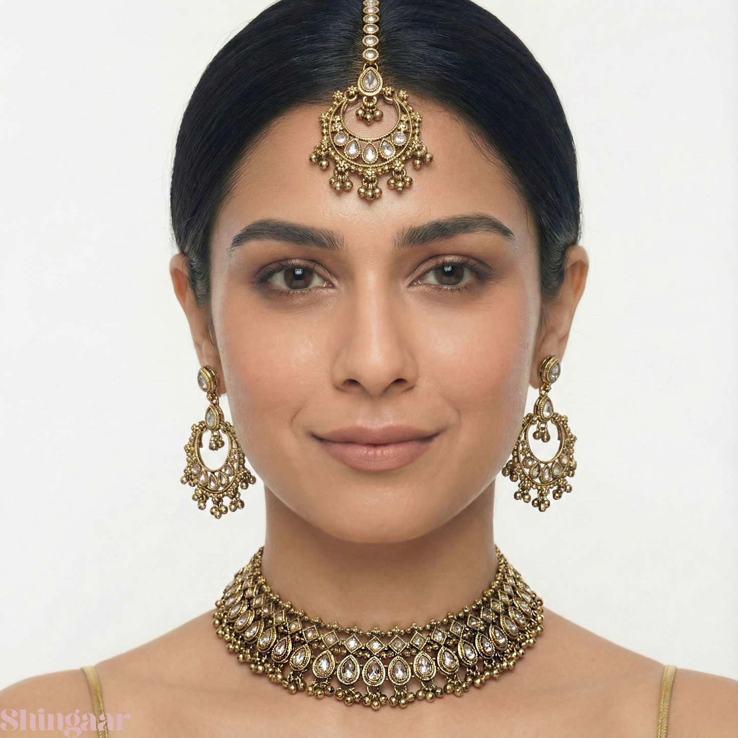 An heirloom-inspired regal antique gold necklace set with matching earrings and maang tikka—designed to elevate your presence with quiet luxury and timeless confidence at weddings and festive moments.